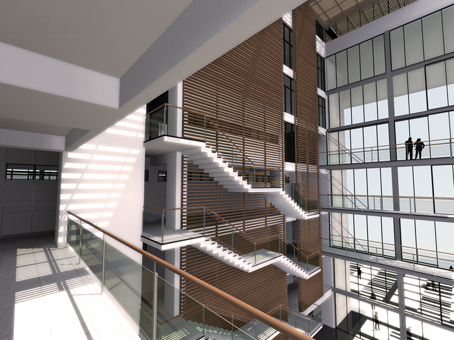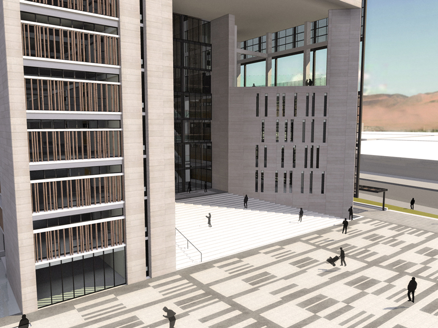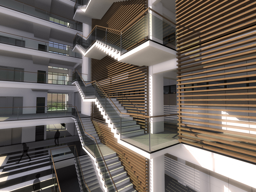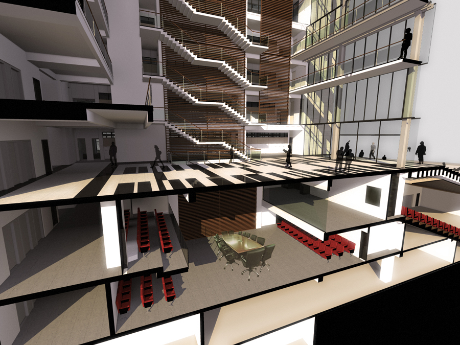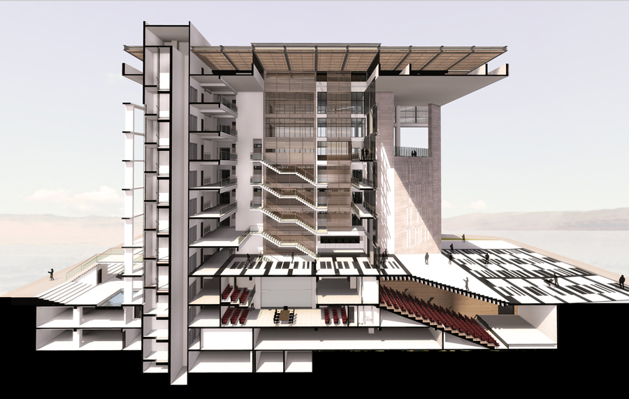 Un hall de 9 alturas construye la idea del Patio Cívico, abierto a la comunidad e interrelacionando un piso con otro. Las escaleras y las circulaciones rodean este espacio, abalconándose al nivel de acceso público del edificio.